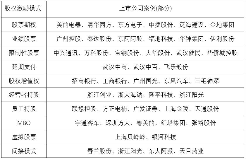 需要說明的是,上表看似激勵模式類型很多,實際上有些并不是真正的激勵模式,如“員工持股、經(jīng)營者持股”是一個激勵對象的概念而不是激勵手段的概念;還有些是上市公司實施的一些不需證監(jiān)會審批、僅股東大會表決通過即可以實施的一些變通的激勵方案。