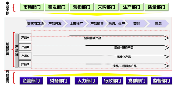 組織運作機制可以整體概括為:前臺經(jīng)營、中臺支撐、后臺服務。流程體系設(shè)計需要以組織架構(gòu)為基礎(chǔ)和前提,因此,項目組將通過行業(yè)最佳實踐、能源技術(shù)公司組織運作模式分析,與能源技術(shù)公司中高層進行充分研討,進一步明確組織架構(gòu)及運作模式。項目組初步認為,能源技術(shù)公司需要建立以產(chǎn)品線為主線,中臺和后臺全力支撐產(chǎn)品,從需求立項、開發(fā)、上市推廣、銷售、采購生產(chǎn)、交付、售后的全生命周期組織運作機制,打破部門墻,建立矩陣式柔性組織體系,支撐流程的高效運轉(zhuǎn)。