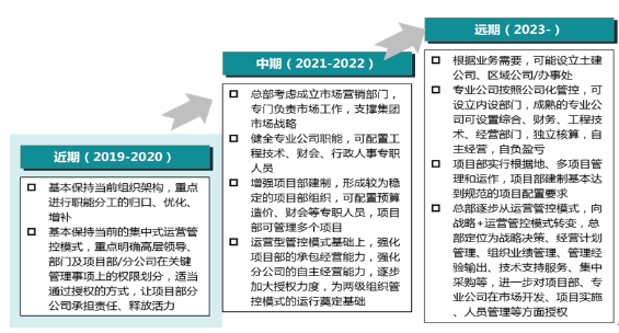 圍繞公司的五年規(guī)劃,提出其組織管控的三個(gè)階段發(fā)展路線圖,據(jù)此提出近期、中期、遠(yuǎn)期三個(gè)階段的組織優(yōu)化方案,細(xì)化近期和中期的部門職責(zé)劃分。