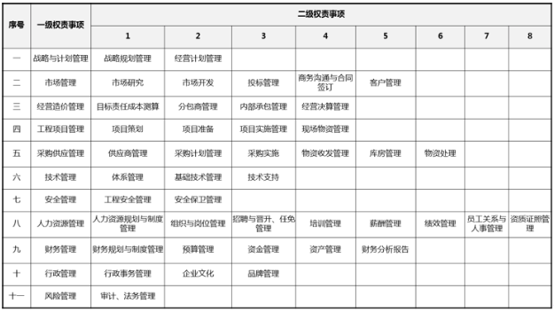 基于組織架構(gòu)和功能定位,梳理出11個(gè)一級(jí)大類,共43個(gè)二級(jí)細(xì)類下的各項(xiàng)管控事項(xiàng),逐一明確各級(jí)管控權(quán)限。