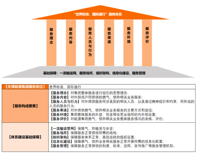 在服務(wù)體系框架搭建中,對集團(tuán)內(nèi)部服務(wù)燃?xì)?、供熱服?wù),以用戶體驗(yàn)為主線,進(jìn)行服務(wù)全生命周期梳理,并提煉了服務(wù)理念、服務(wù)內(nèi)容、服務(wù)人員與行為、服務(wù)渠道、服務(wù)環(huán)境、服務(wù)評價六大服務(wù)構(gòu)成要素,在此基礎(chǔ)上,搭建了能源服務(wù)保障體系框架。如下所示: