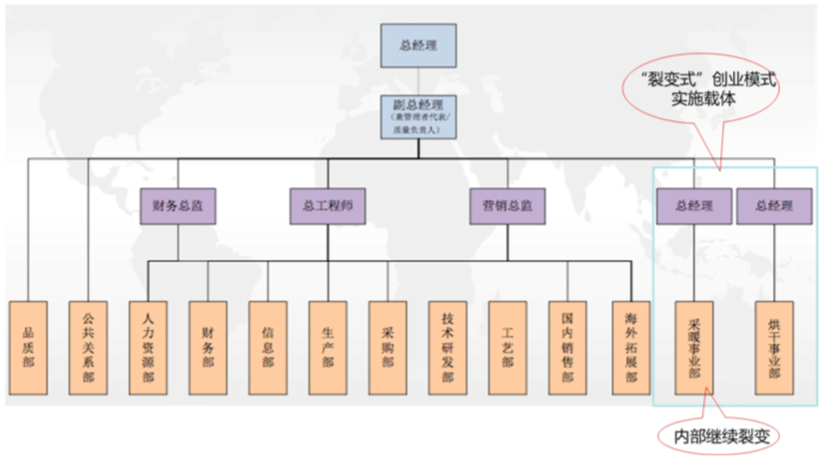 3、通過“裂變式”創(chuàng)業(yè)形成職能+事業(yè)部部式的混合組織形式。