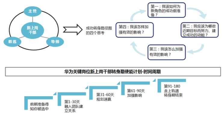 對于關鍵崗位的干部,如果管理跨度比較大,華為還會單獨為他們做新干部上崗的90天轉(zhuǎn)身輔導計劃。
