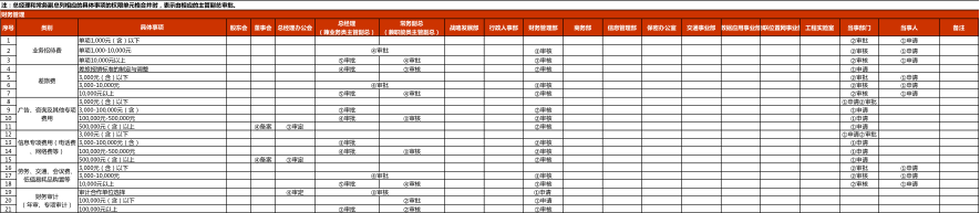 基于組織功能分析及前期對公司的了解,建立核決事項清單,明確各關(guān)鍵事項在部門之間的權(quán)限分配。核決事項清單對不同管控條線下的“關(guān)鍵權(quán)限事項”進(jìn)行梳理,厘清其權(quán)限邊界;部分關(guān)鍵權(quán)限事項從不同的角度來看,可能分屬于不同的管控層面或管控條線(如采購管理中采購付款也屬于財務(wù)管理),并不影響權(quán)限事項的決策運行:在實際運作中,該權(quán)限事項如果同時涉及多條權(quán)限,則必須按照滿足所有條線的權(quán)限規(guī)則來運行,即遵行“從嚴(yán)準(zhǔn)則”。