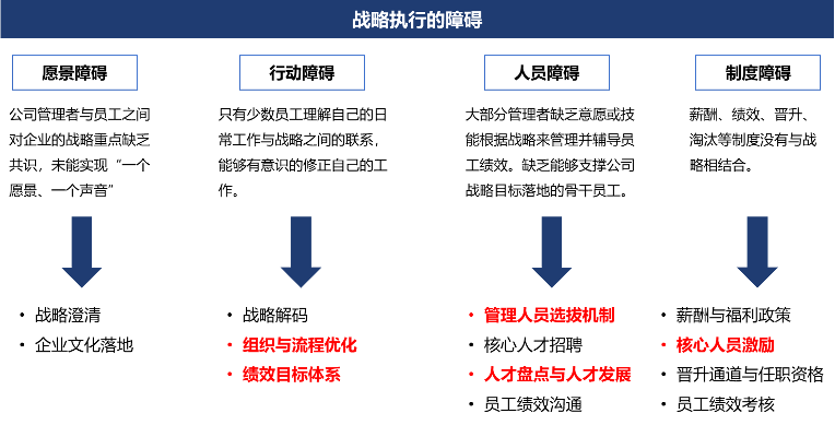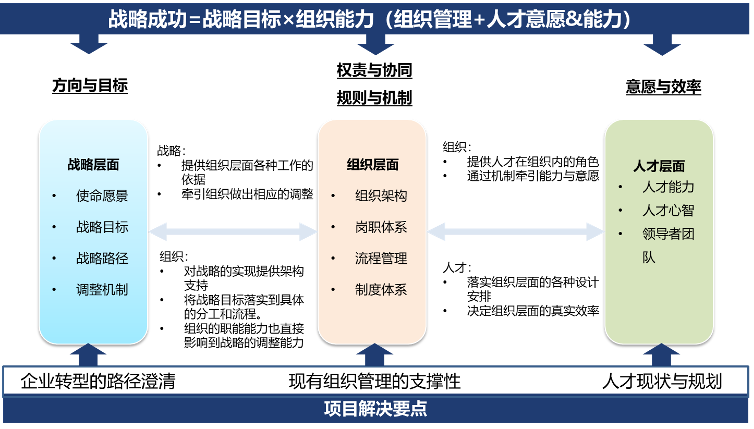 為系統(tǒng)的解決該公司的管理問題,漢哲咨詢從戰(zhàn)略成功的角度出發(fā)分別明確了組織層面與人才層面的項(xiàng)目著力點(diǎn)