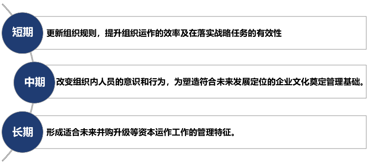 咨詢項(xiàng)目不是一蹴而就的,真實(shí)能夠改變企業(yè)需要一個(gè)中長(zhǎng)期的過程,由企業(yè)進(jìn)行內(nèi)化, 為此漢哲咨詢提出了3年服務(wù)期,并針對(duì)此項(xiàng)目提出了短期、中期、長(zhǎng)期的落地目標(biāo):