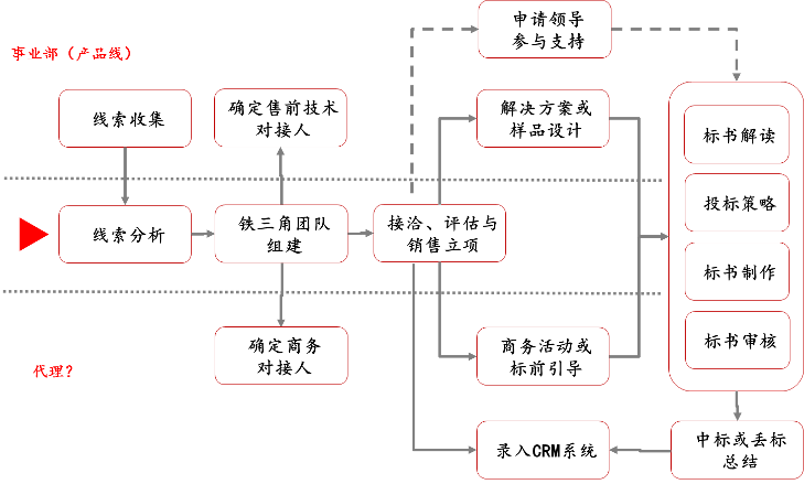 針對個(gè)細(xì)分模塊,建立基于市場的流程運(yùn)行邏輯,如單一項(xiàng)目線索跟進(jìn)與成交的業(yè)務(wù)運(yùn)作邏輯如下: