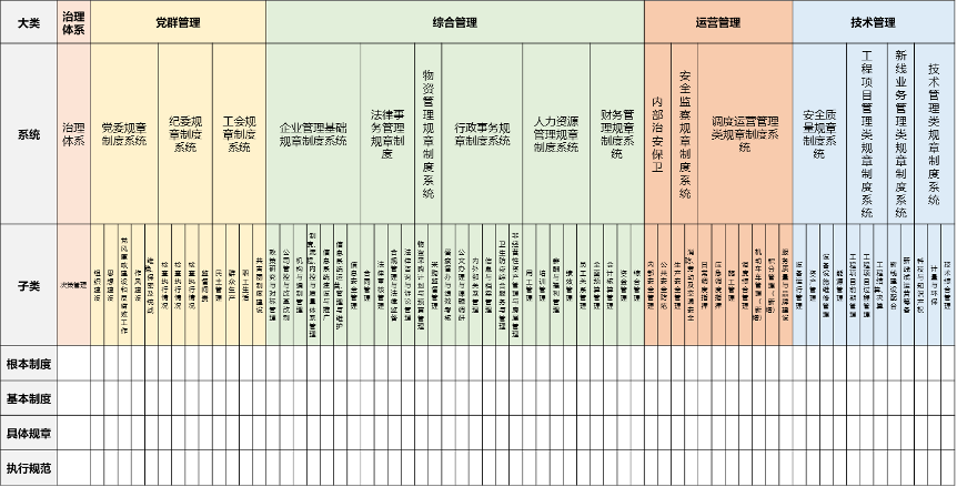 梳理總部及所屬單位的根本制度、基本制度,確保兩級根本制度、基本制度上下銜接貫通。下圖為地鐵公司的兩級制度體系框架:
