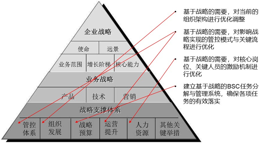 同時(shí),又要全面理順企業(yè)戰(zhàn)略、業(yè)務(wù)戰(zhàn)略與戰(zhàn)略支撐體系的關(guān)系,對(duì)其中的關(guān)鍵體系進(jìn)行 戰(zhàn)略性優(yōu)化與調(diào)整: