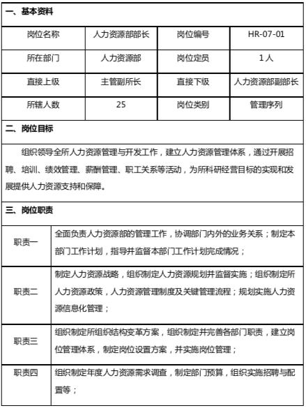 通過工作分析對(duì)崗位有了更為清晰了解的基礎(chǔ)上,形成了規(guī)范的《人力資源部部長(zhǎng)崗位說明書》。