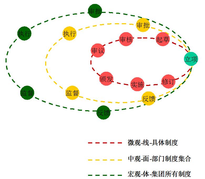 制度建設(shè)是一個(gè)復(fù)雜的系統(tǒng)工程,它由宏觀、中觀、微觀三個(gè)循環(huán)體系構(gòu)成(見(jiàn)圖1),外部層次循環(huán)遞進(jìn)指導(dǎo)內(nèi)部層次循環(huán)的建設(shè)方向,內(nèi)部層次循環(huán)影響外部層次的執(zhí)行效果。微觀循環(huán)是單一制度的生命周期管理,指一個(gè)制度從立項(xiàng)、制定到廢止的閉環(huán)管理過(guò)程;中觀循環(huán)是各職能部門對(duì)相應(yīng)制度集合的管理,體現(xiàn)具體部門職能面的工作;宏觀循環(huán)是指企業(yè)作為一個(gè)整體,對(duì)其全部制度的運(yùn)行管理。宏觀循環(huán)指導(dǎo)中觀循環(huán)的方向,中觀循環(huán)確定微觀循環(huán)的主體,各個(gè)循環(huán)由體到面、由面到條線、由條線到點(diǎn),形成一個(gè)自我約束的管理體系。