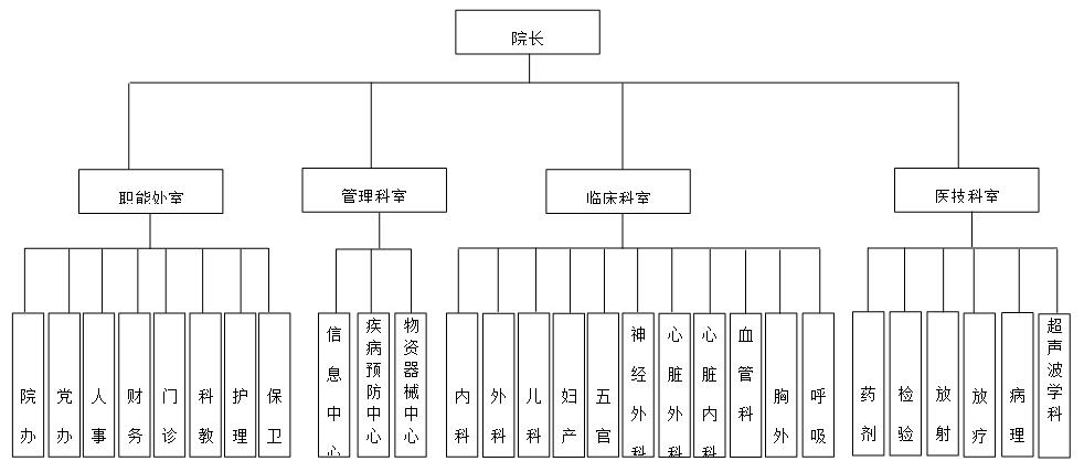 N醫(yī)院成立于1990年,是以治療心肺血管疾病為重點的大型綜合性醫(yī)院。醫(yī)院占地面積5萬平方米,醫(yī)療用房9萬平方米?,F(xiàn)有職工近1000人,其中高級專業(yè)技術(shù)人員100余人。臨床、醫(yī)技科室15個,床位500余張。具有現(xiàn)代化設(shè)施和人文理念的心胸血管外科大樓,具有百、萬級凈化層流手術(shù)室20間,術(shù)后監(jiān)護(hù)病床30張,新建的門診綜合樓2.8萬平方米,為患者提供的人性化醫(yī)療服務(wù)。心臟外科、心臟內(nèi)科、血管科、胸外科、呼吸內(nèi)科是醫(yī)院的重點特色科室,醫(yī)院的組織結(jié)構(gòu)圖如下: