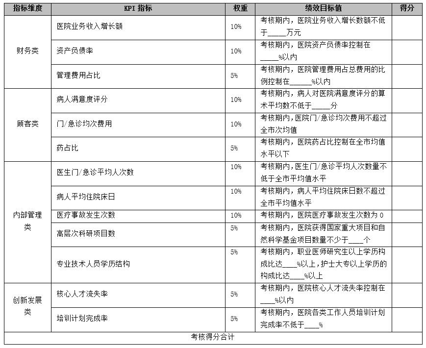 根據(jù)KPI指標(biāo)以及崗位職責(zé),形成了各個崗位的績效考核指標(biāo),由于崗位眾多,選取該醫(yī)院院長的考核指標(biāo)作為范例。